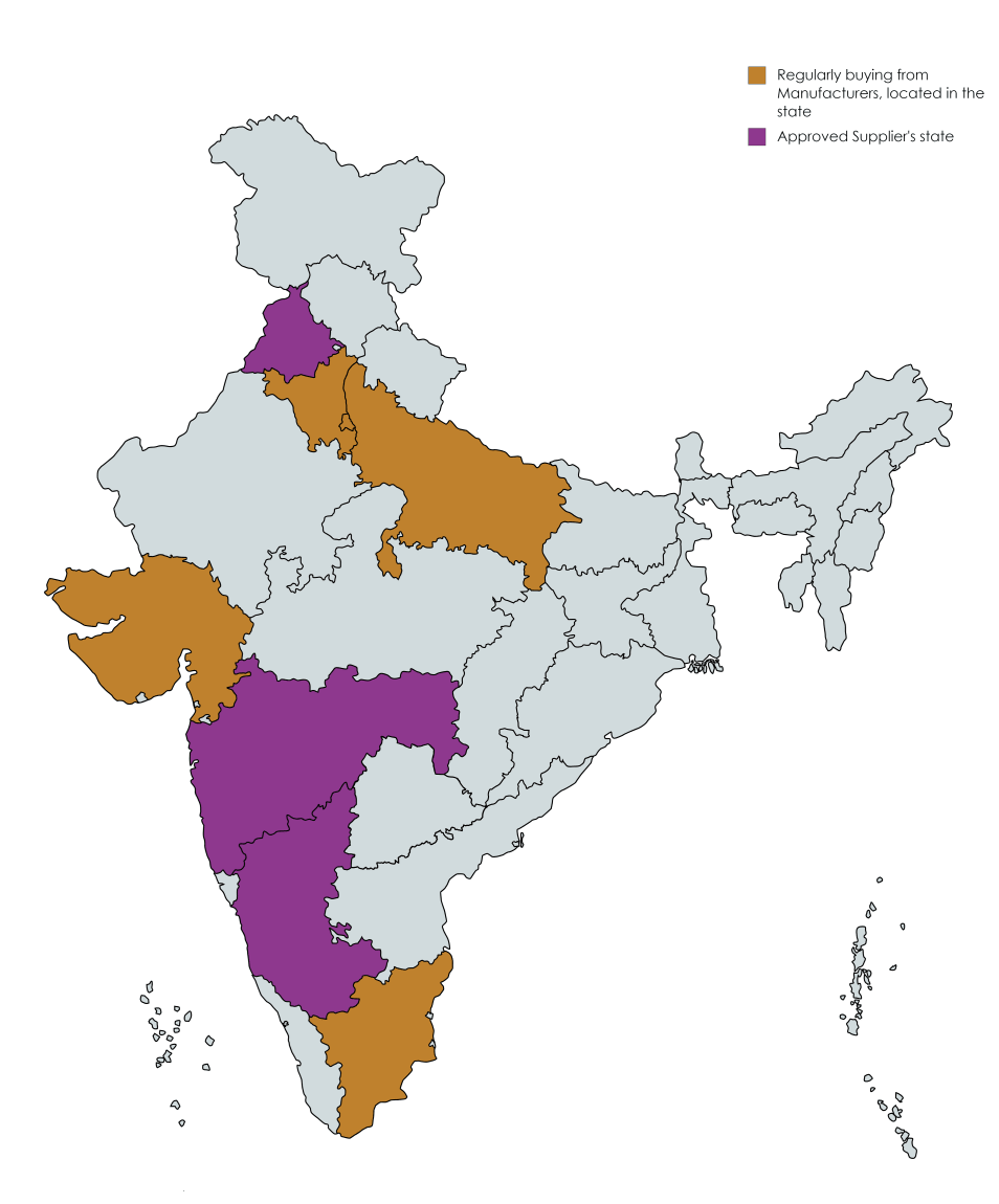 In India, the factories are set-up cluster-wise. Each cluster caters to a specific segment of end-use. Affinity International has approved suppliers located in almost all major manufacturing hubs in India.